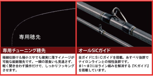 這支以文宣看起來,我個人粗淺的看法,竿先應該是LITMITED  BAY  FUKASE的性質差不多(細、軟、信號敏銳),"極細仕掛け&極小エサでも確実に落下イメージが 可能な鋭敏穂先です。一瞬の居食いも見逃さず、 軽く聞き合わす操作だけで、しっかりフッキング させます。",這段文字我大概翻一下,竿先敏感度使用細線組、極小餌料也能確實看到落下的樣子。  突然間(瞬間)的就餌信號也不會看不見,輕輕的察看操作也沒關係(竿先二次確認),能夠確實的掌控信號。